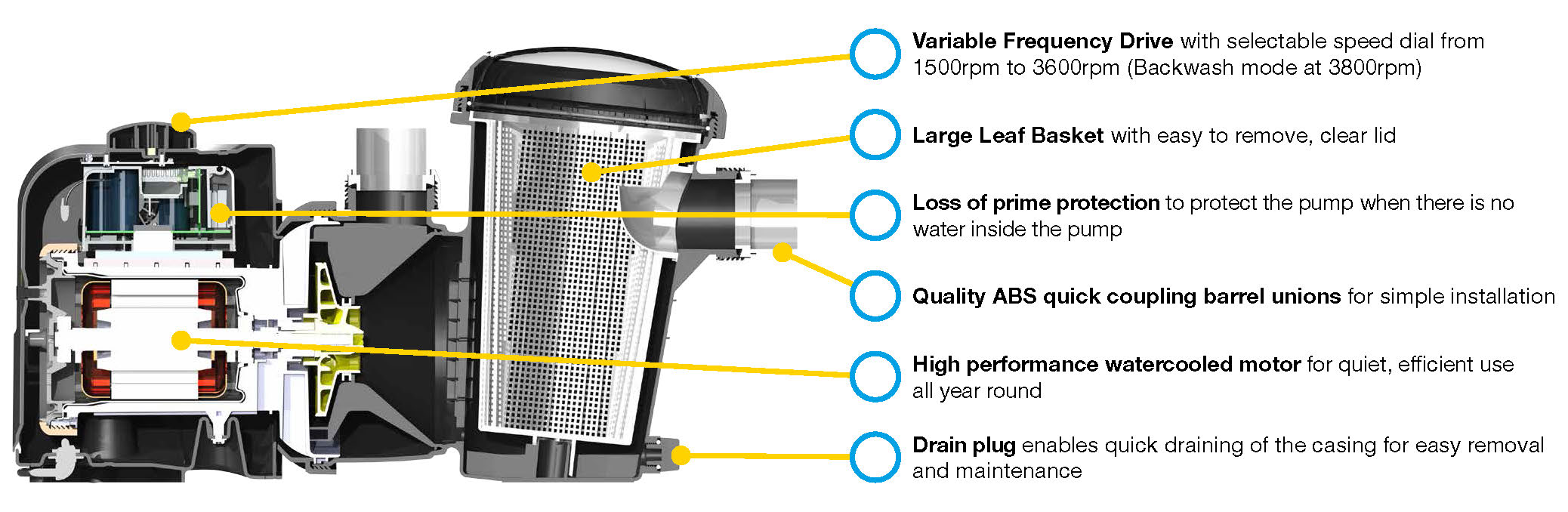 Fully Variable Speed Control – The ProMaster offers the pool owner and operator total control over the speed at which the pump needs to operate, from 1,500rpm to 3,600rpm